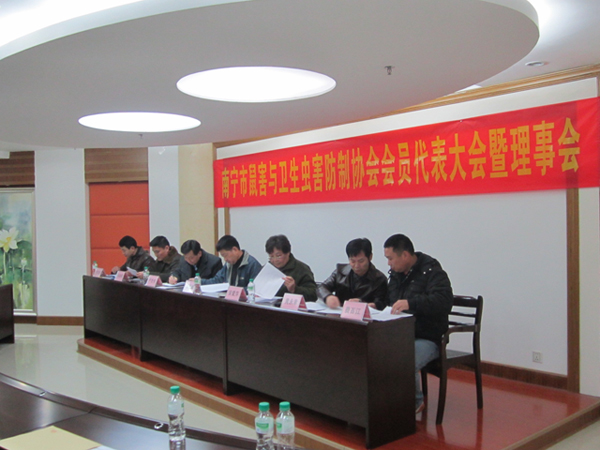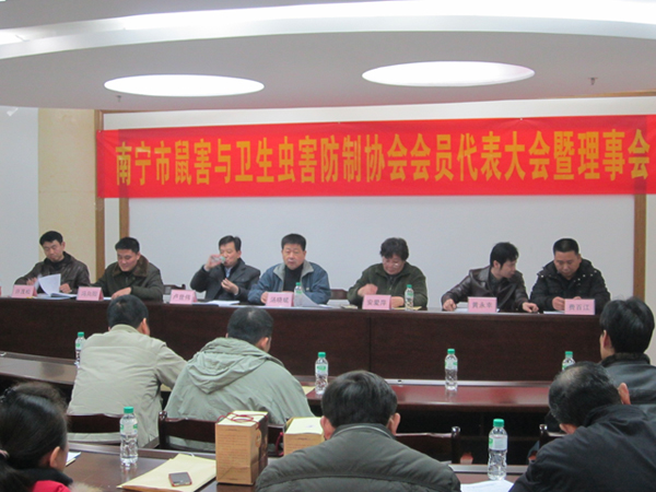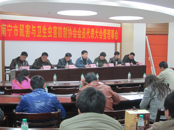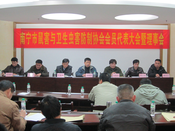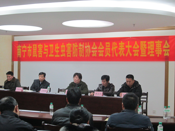 2012年元月9日,南寧市鼠害與衛(wèi)生蟲害防制協(xié)會在南寧市衛(wèi)生局召開了協(xié)會理事及全體會員大會,會議審議并全體通過了協(xié)會工作報告、財務報告及新一屆協(xié)會領導選舉??祪艄究偨?jīng)理黃永幸先生當選新一屆協(xié)會副會長。圖為南寧市衛(wèi)生局長湯曉斌、愛衛(wèi)辦常務副主任盧世偉、安愛萍會長(原南寧市疾控中心黨委書記)、愛衛(wèi)辦副主任許茂松(協(xié)會副會長)、副會長馮向陽(廣西自治區(qū)疾控病媒專家)、副會長黃永幸、秘書長費百江在主席臺就座。